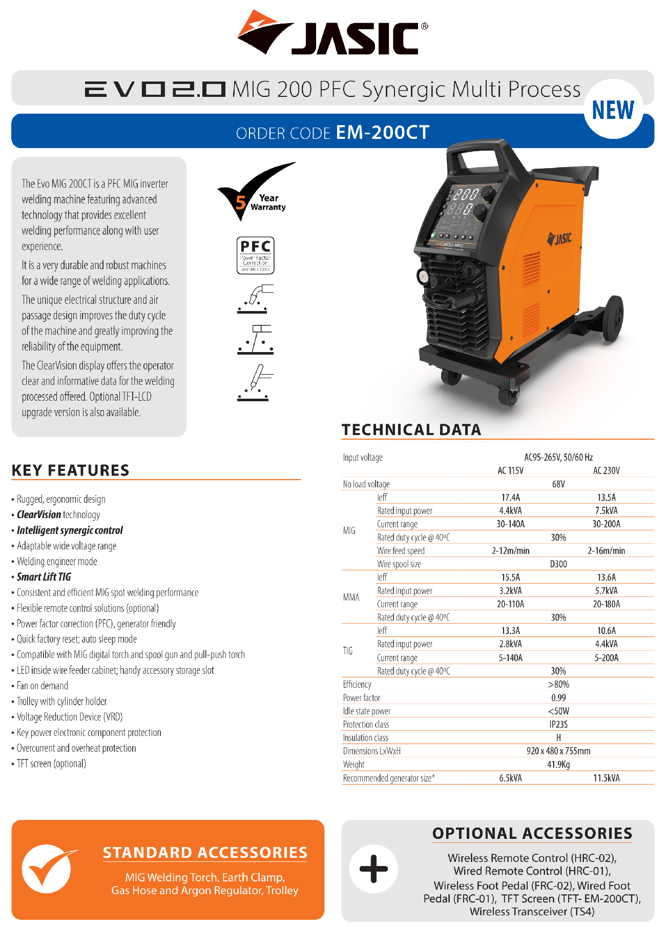 Jasic EVO 2.0 Mig 200CT PFC Wheels Key Features Rugged, ergonomic design ClearVision technology Intelligent synergic control Adaptable wide voltage range Welding engineer mode Smart Lift TIG Consistent and efficient MIG spot welding performance Flexible remote control solutions (optional) Power factor correction (PFC), generator friendly Quick factory reset; auto sleep mode Compatible with MIG digital torch and spool gun and pull-push torch LED inside wire feeder cabinet; handy accessory storage slot Fan on demand Trolley with cylinder holder Voltage Reduction Device (VRD) Key power electronic component protection Overcurrent and overheat protection TFT screen (optional) The concept of “JASIC Quality” goes well beyond the product quality control. It’s about implementing sustainability strategies in all aspects of JASIC’s operation. Holder of ISO 9001:2015 and ISO 14001:2015, JASIC strives to develop reliable, energy-efficient and eco friendly solutions to the global welding market. JASIC Quality ensures reliability and performance certified by the most prodigious quality management institutions in the world. A crucial part of JASIC Quality, our integrated test laboratories have been certified as witness test laboratories by both TÜV Rheinland and CSA Group. All welding power sources are comprehensively inspected with 42 test procedures, assuring product compliance with the most stringent quality and safety standards. Jasic Mig 160 PFC JASIC is a forerunner of IGBT inverter welding technology and its products were used in some of the most ambitious projects in modern history such as the Beijing Bird’s Nest Stadium. Founded in 2005, the company has grown into an international business with a $200 million annual turnover* and over 1000 staff worldwide. With 3 RDI centres, JASIC have more than 150 R&D personnel and industry-leading integrated test laboratories certified by TÜV Rheinland and CSA. Exporting to over 80 countries and regions, Jasic has an annual production capacity of 1 million machines. JASIC is driven by its passion for the world’s welding needs, and strives to deliver reliable and ecological solutions Jasic EVO 2.0 Mig 200CT PFC Wheels
